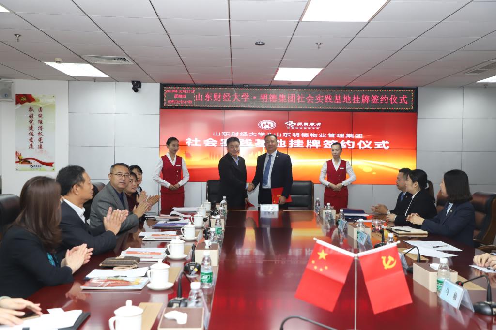10月31日上午,公司与山东明德物业管理集团社会实践教学基地签约暨授牌仪式在明德集团党建会议室举行。山东明德物业管理集团董事执行总裁王正坤、副总裁邹心忠、副总裁金艺、人力资源中心总经理刘丹丹、太阳成集团tyc33455ccwww合作发展处副处长邵伟然、公司党委书记李旭刚、经理刘军、党委副书记张红燕及企业相关人员、师生代表参加了本次签约暨授牌仪式。