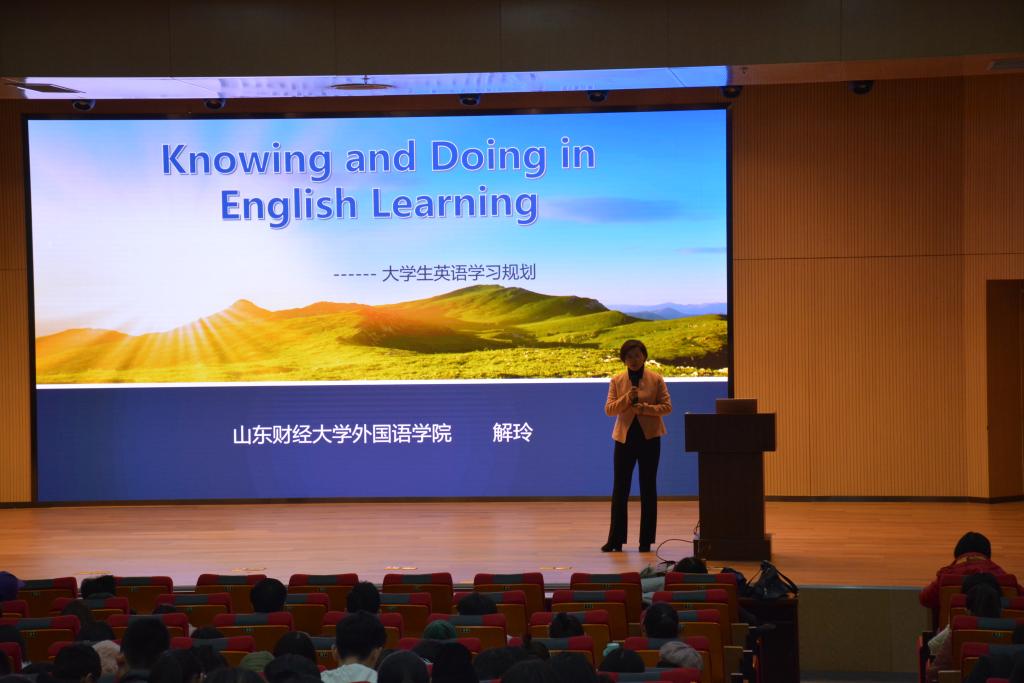 解玲先表达了对公司院徽装饰感与蕴意的喜爱,并以对公司学子的美好希望展开本次讲座。在讲座中,解玲首先讲述了外语的起源,从“appalling numbers” 、“interesting English”和“beautiful English”三个方面详细地阐述了老员工应有的单词量、英语的趣味性以及英语的美,启发员工们应发现英语学习的乐趣,而不是死学英语。解玲通过现场跟读的互动模式与视频讲解纠正了当今老员工对“记单词、练听力、提口语、写作”四个方面的偏见,并分别从以上四个方面提出了有效的学习方法。最后,解玲介绍了多种含金量高的英语考试与赛事,为同学们的大学英语学习提供了努力的方向。