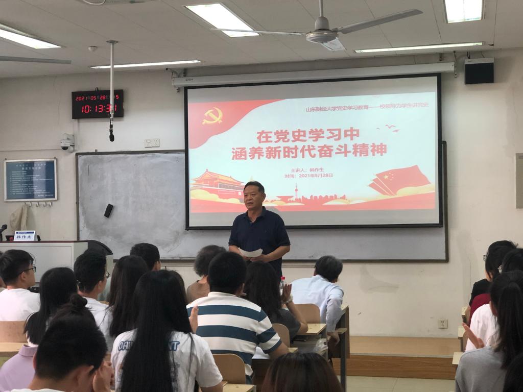 韩作生从当前的中美关系谈起,简要回顾了中国共产党在新民主主义革命时期、社会主义革命和建设时期,以及改革开放时期的历史,结合自己的亲身经历和成长历程,讲述了对“学史明理、学史增信、学史崇德、学史力行”的理解和感悟,并从“党史学习的重要意义”;“中国共产党始终是中国青年的鼓舞者、组织者和领导者”;“从百年党史中汲取智慧和力量,争做新时代的奋斗者”三个方面做了专题报告。