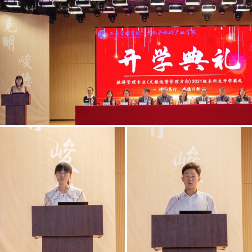 旅游管理专业推免生魏天雨、石珂蔚代表在校生向新同学表示欢迎。魏天雨以“书写青春篇章”为题,结合自身经历鼓励学弟学妹们勤奋自律、刻苦学习,积极参加社会实践,锻炼自我、提高自我。石珂蔚分享了自己的学习经历以及对旅游管理专业的理解和感悟,她鼓励学弟学妹们努力探索专业学习的乐趣和价值。2021级本科生朱君赫代表新生表达了对老员工活的美好憧憬和对专业学习和实践的期待。他表示要秉承山财大“克明峻德、格物致知”的校训精神,以全新的面貌规划学业和人生,以优秀学长学姐为榜样,以国家需要为奋斗之本,以知行合一为修身之本,珍爱年华、只争朝夕、博学笃行、追求卓越,立志成为山财大的骄傲!