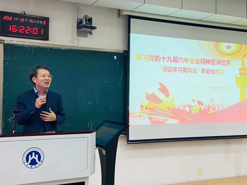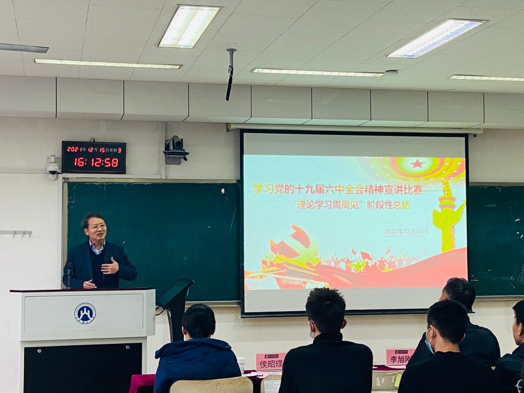 韩作生充分肯定了同学们的精彩表现,结合对参赛选手的点评又深入地对党的十九届六中全会精神进行了宣讲,他指出要认真学习和贯彻落实好党的十九届六中全会精神,准确把握“两个确立”的决定性意义,把“两个确立”转化为做到“两个维护”的思想自觉、政治自觉、行动自觉。要统一思想、凝聚共识、汇聚力量,听党话、感党恩、跟党走,在提升思想中坚定理想信念,践行使命担当;要以史为鉴、开拓未来、不忘初心、牢记使命,厚植爱国主义情怀,把爱国情、强国志、报国行自觉融入坚持和发展中国特色社会主义事业中。要积极应对新形势、新挑战、新使命,在传承和创新中不断提升自身能力,用知识奉献社会,用实践实现价值,在经济社会高质量发展中展现青春英姿、迸发青春活力,为实现第二个百年奋斗目标、实现中华民族伟大复兴而努力奋斗。