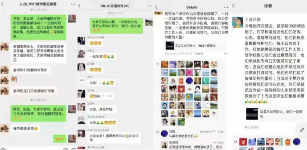 吕静、齐蕾两位青年教师同时兼任班级的班主任工作,她们在召开完班会后,表示着实被这帮00后感动到了。在学校、老师最挂念员工的吃饭、心态、情绪等问题时,他们在挂念着默默守护他们、打地铺睡觉的餐厅工作人员;当辅导员班主任等担心他们会过度恐慌时,同学们早就因为可口的饭菜忘记了害怕。窦大海、罗文卿等老师也在上课时与员工积极沟通,结合疫情防控的严峻形势,着重强调公司、公司在疫情防控方面的精密部署及院系领导、辅导员老师在关心员工健康等方面的努力。