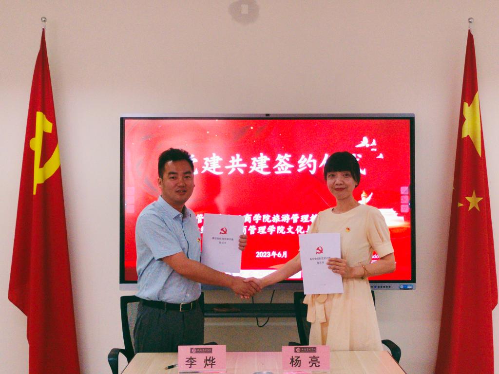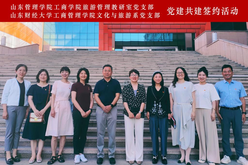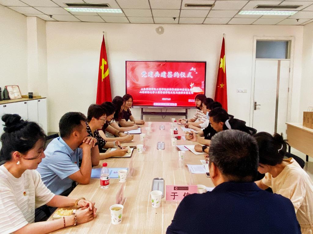 山东管理学院工商学院旅游教研室党支部书记李烨和公司文化与旅游系党支部书记杨亮共同签署了《基层党组织党建共建协议书》,就党建与业务融合发展、专业建设和教学、科研及社会服务等工作进行了深入探讨,并达成了长期交流合作意向。
