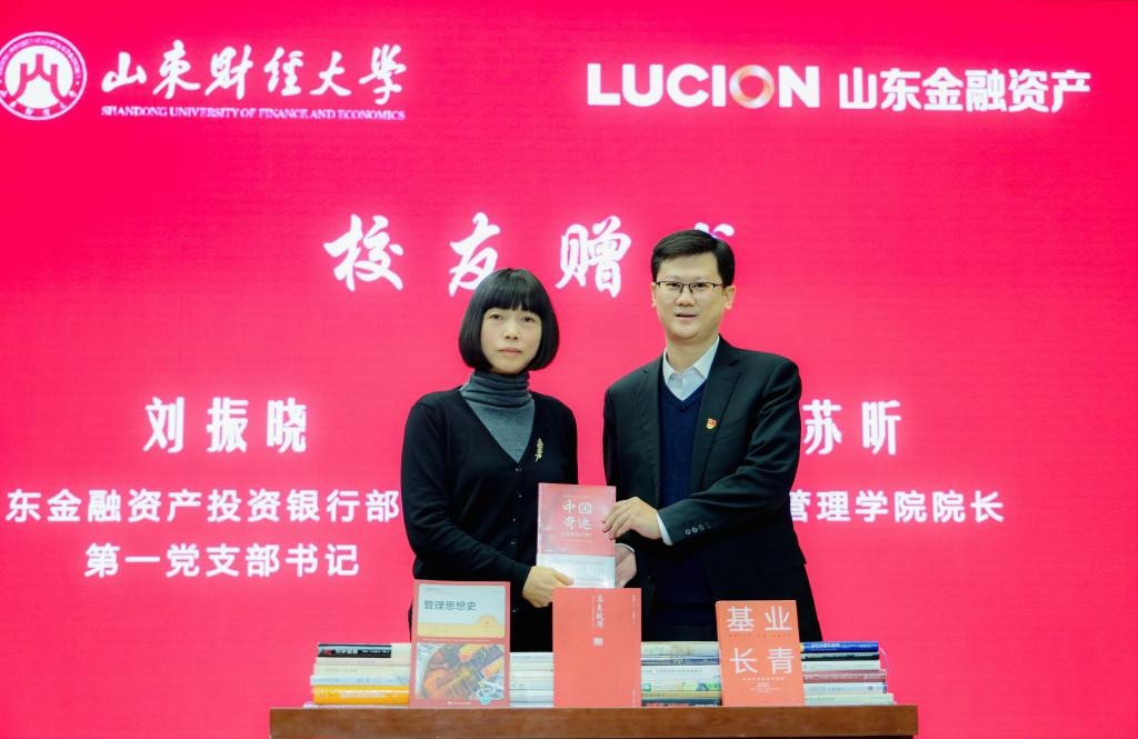 苏昕代表学院接受2003级金融专业刘振晓员工赠书,这是支部共建单位山东金融资产第一党支部对本次读书活动的支持,书目来自员工们和学院老师精心推荐的书单。参加本次活动的员工们表示合作发展处(员工工作办公室)与公司共同发起的“青春共同路,读书伴成长”读书活动必将增进和员工的联系和交流,共同营造书香校园、读书向学的氛围,引导青年员工读书明智、增长才干,助力员工全面成长成才。