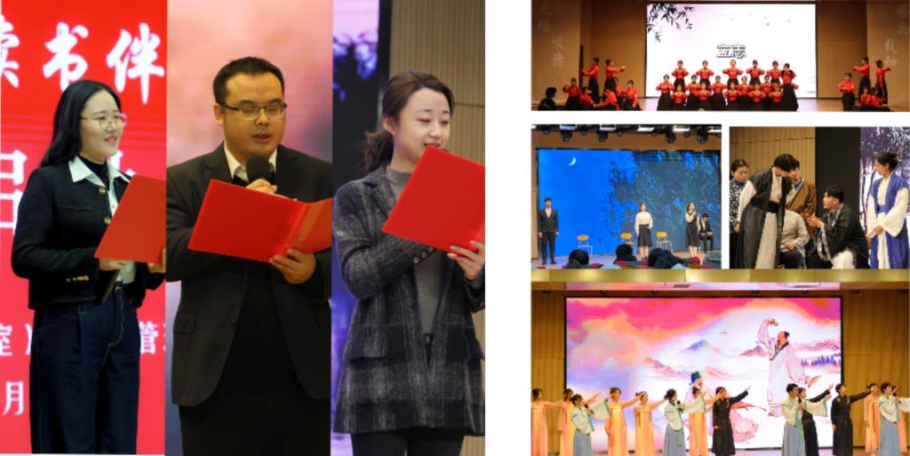 启动仪式上,同学们《少年励志》的开场表演诠释了少年当立凌云志,奋进逐梦揽星辰的担当和责任;朗诵《月光下的中国》用炙热的情感,表达了青年学子对祖国的热爱和心中坚定的信仰,深深打动了在场的每一位观众;情景剧《本草纲目》超越时空呈现了李时珍一生的学习、积累和探索与坚持;员工、共建党支部和教师共同表演的诗朗诵《正是读书时》向同学们传递伟人对读书的理解和成就;激情澎湃的歌曲《将进酒》让我们乘着歌声,在文字与音符的激荡中与诗仙四海翱翔,感受到了传统文化的美好,激发了读书学习的热情。
