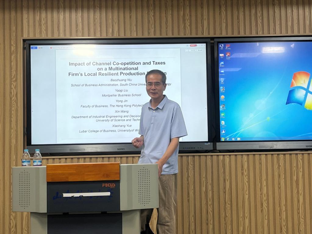 7月30日上午,工商大讲堂第132期暨“洞见·商道”员工讲坛第17期在燕山校区逸夫楼104教室顺利举行。本次讲坛特邀美国威斯康星大学密尔沃基分校岳晓航教授作题为“Impact of Channel Co-opetition and Taxes on a Multinational Firm’s Resilient Local Production Decision”的讲座。经理苏昕及学院相关教师和研究生参加了此次讲座,讲座由副经理徐鹏主持。