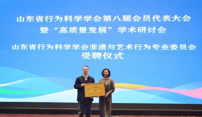 大会由副会长兼秘书长岳雷主持,学术论坛环节由会长黄少英主持。会上,山东省女子学院田立新副董事长做了大会致辞,黄少英会长为成立的山东省行为科学学会非遗与艺术行为专业委员会授牌,非遗与艺术行为专业委员会主任,山东女子学院艺术设计学院副经理赵月作了题为:守护非遗文化根脉,推动艺术创新发展的主题发言。